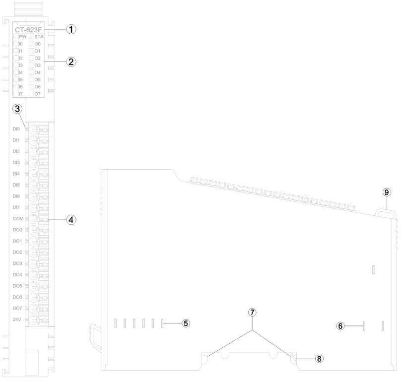 CT-623F: 8-канальный цифровой вход /24 В пост. тока/ тип источника или поглотителя и 8-канальный цифровой выход /24 В пост. тока/ тип источника