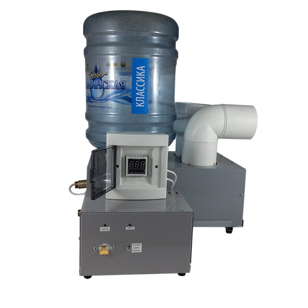 Производительность 0.6 литра в час. Корпус из нержавеющей стали. Автономная работа от внешней ёмкости для воды - стандартной бутыли объемом 19 литров. В комплекте с модулем контроля и управления влажностью.