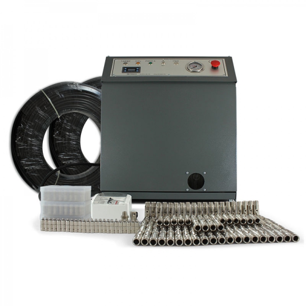 - Комплекс образования и распределения водяного тумана, состоящий из нейлонового шланга высокого давления, латунных соединителей и распылительных микроаэрозольных форсунок с анти-капельным клапаном.