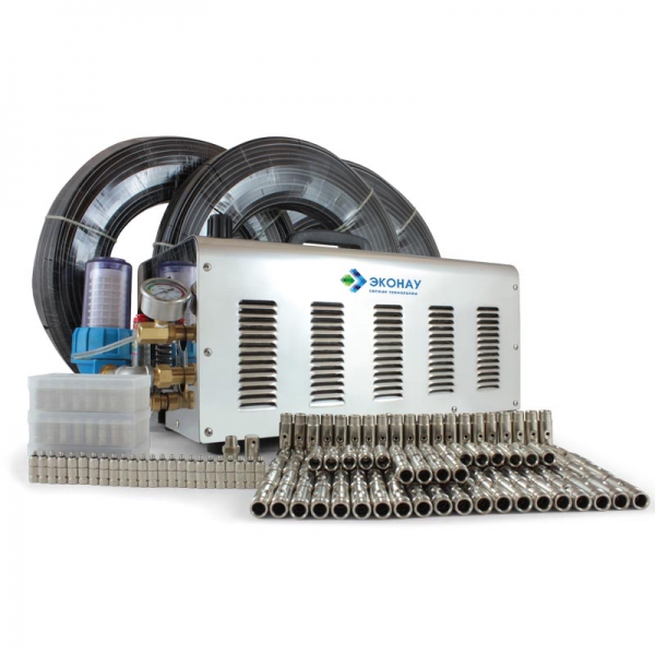 - Комплекс образования и распределения водяного тумана, состоящий из нейлонового шланга высокого давления, латунных соединителей и распылительных микроаэрозольных форсунок с анти-капельным клапаном.